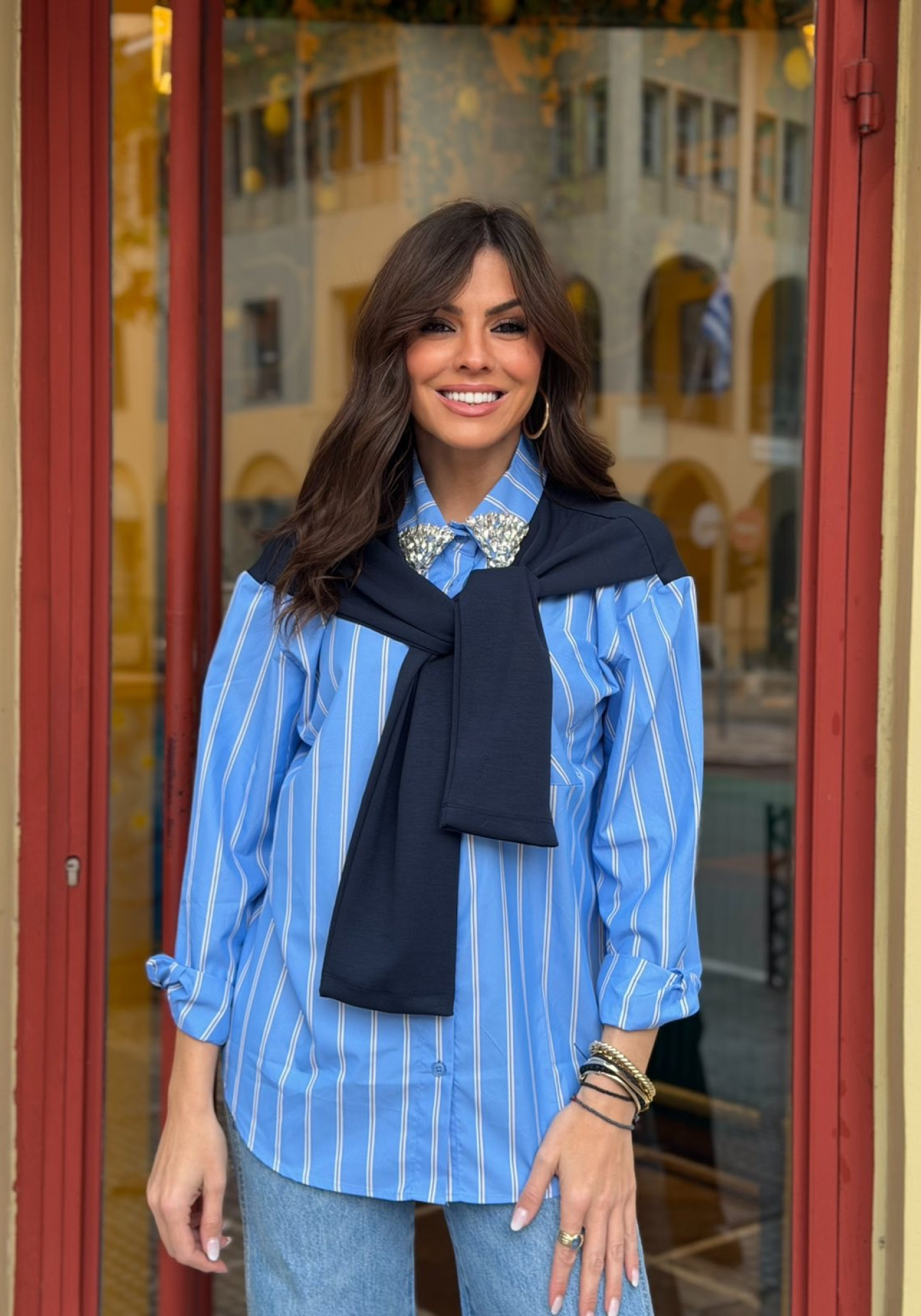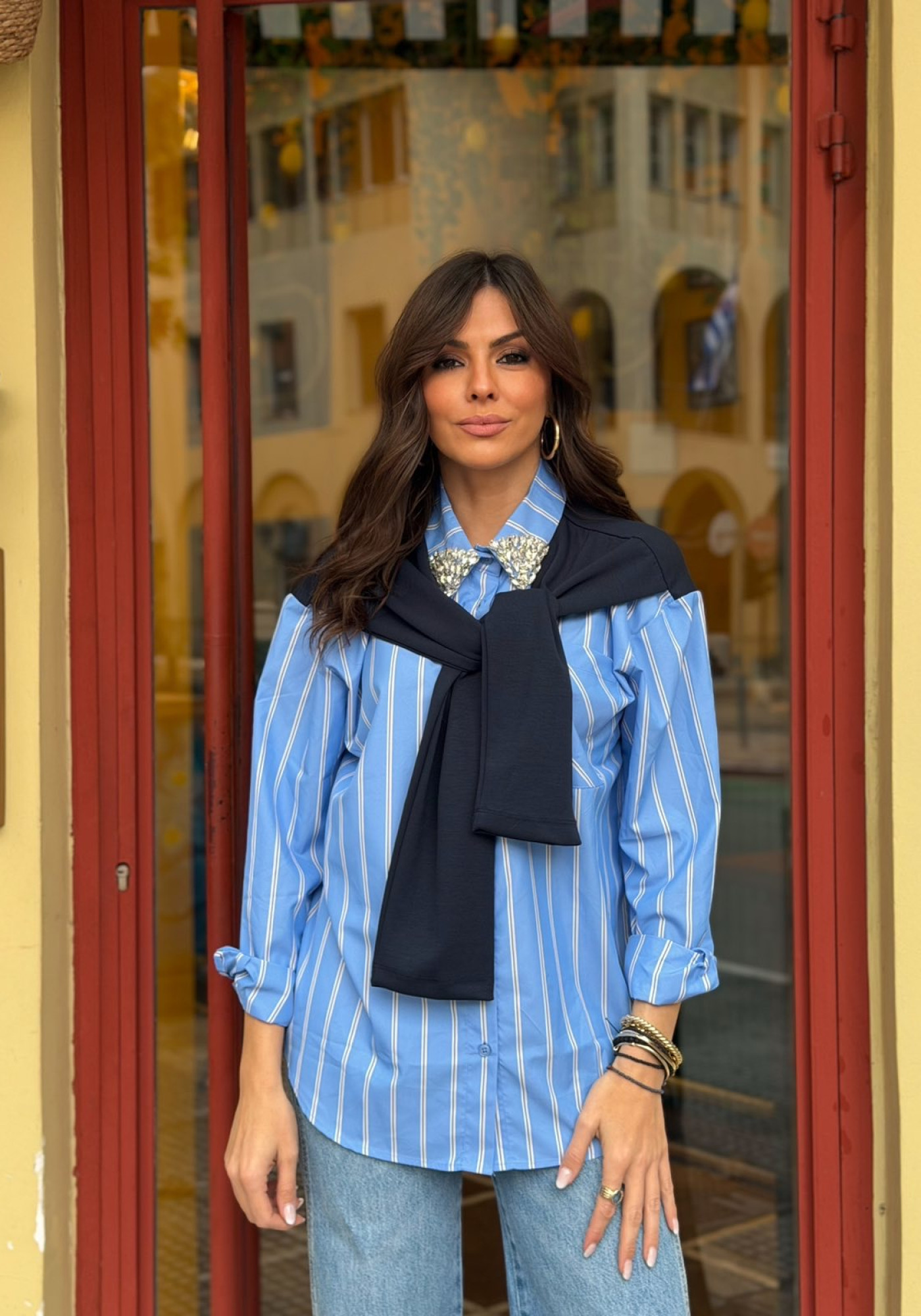 Ριγέ πουκάμισο με στρας στο γιακά