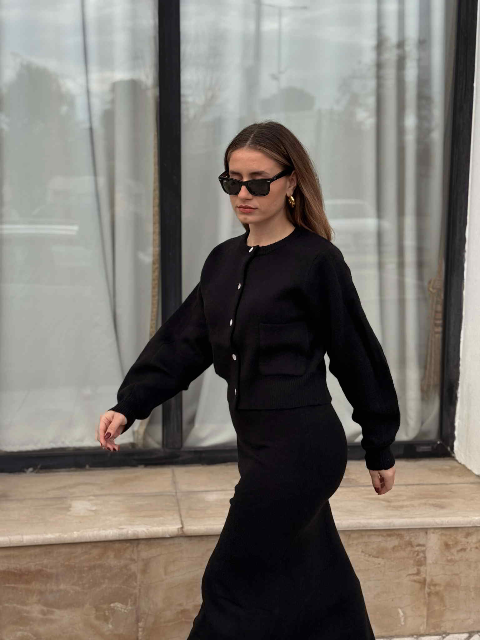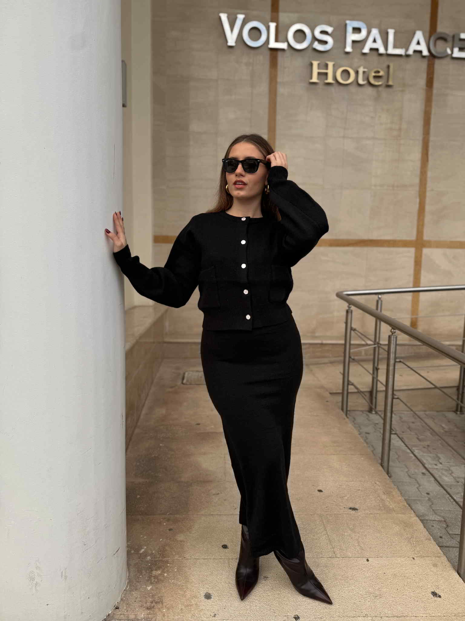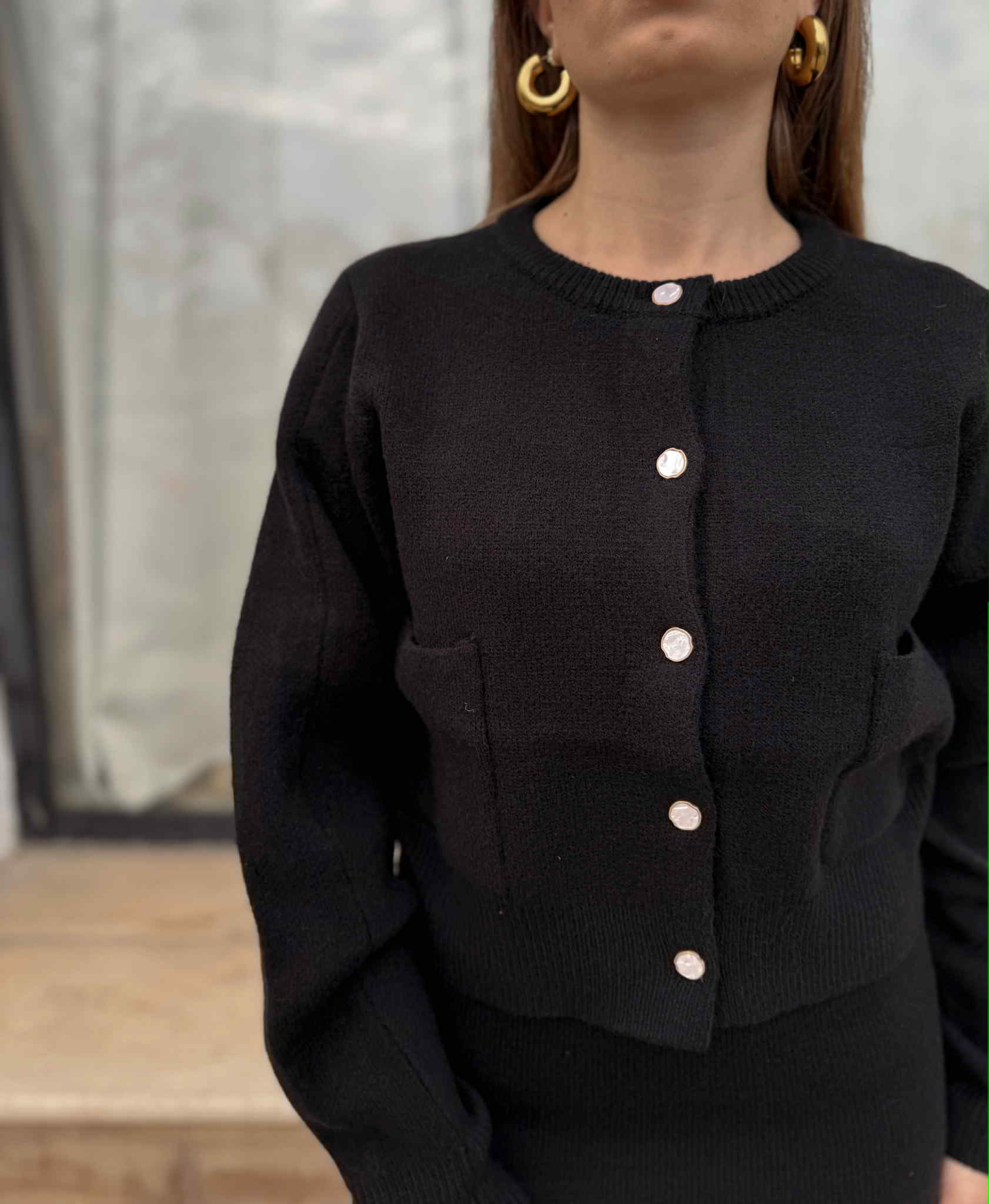 Φούστα μίντι και ζακέτα με τσεπούλες
