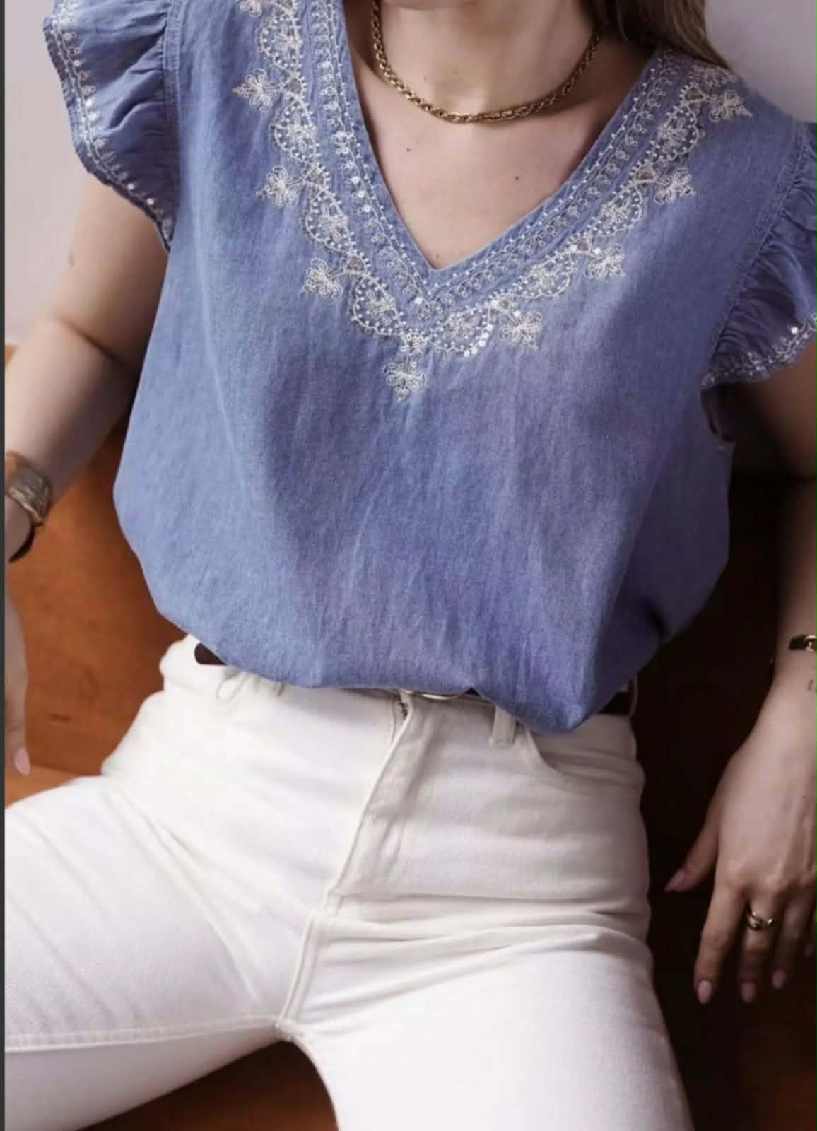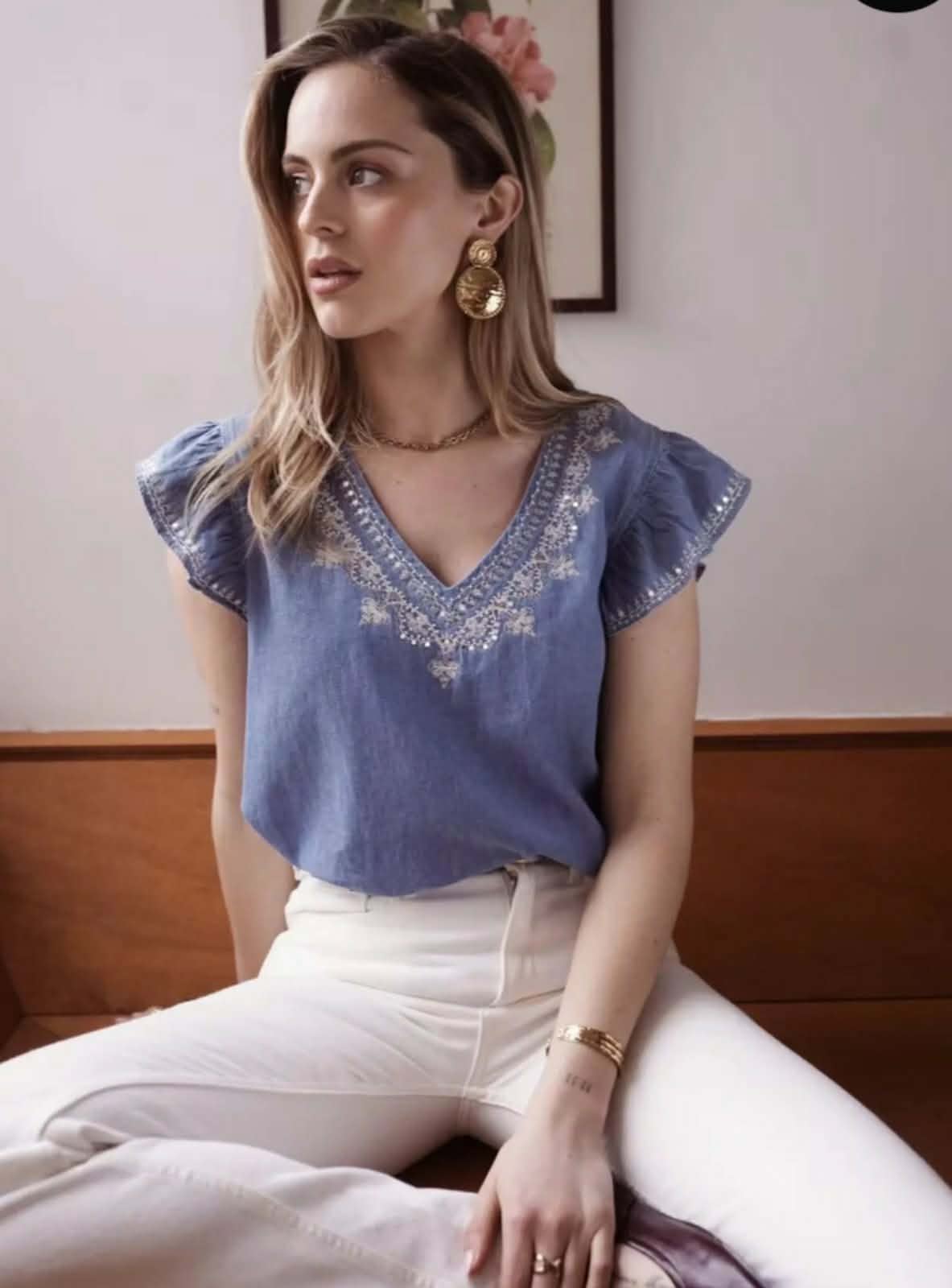 Διαθέτει κέντημα στο μπούστο και στα μανίκια με παγιέτες