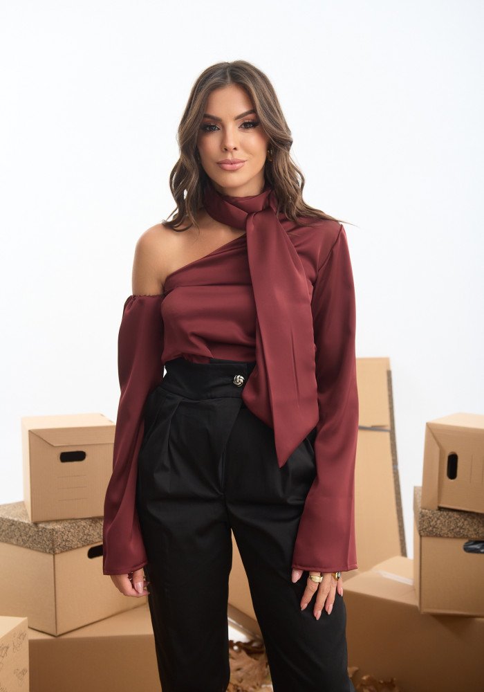 Τοπ σατέν με πεσμένο ώμο και φουλάρι
