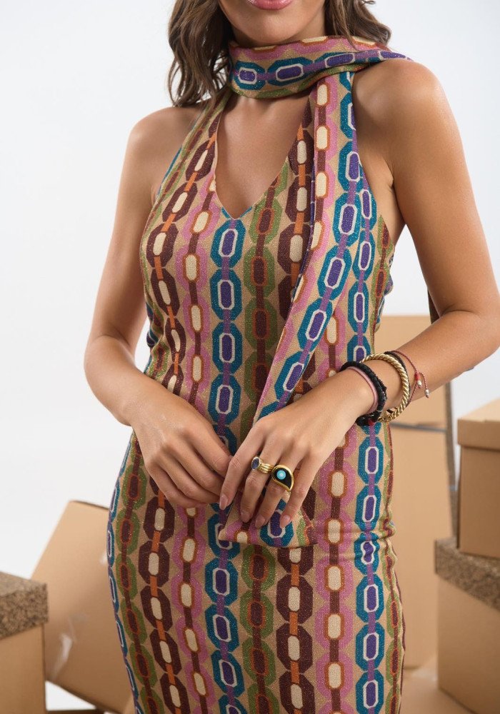 Φόρεμα εμπριμέ με μπολερό και φουλάρι
